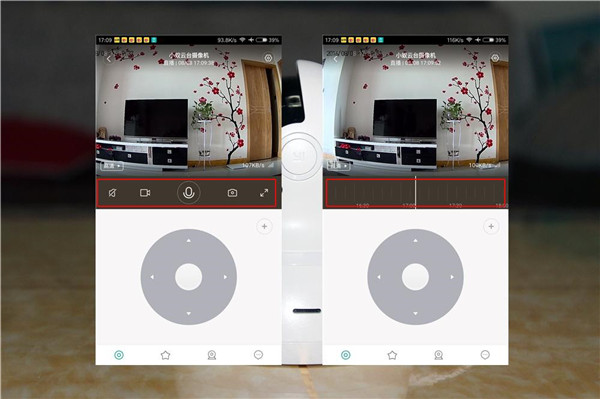 在小蚁云台摄像机的控制页面的中间位置,我们可以看到几个常用的功能按键,音量开关,视频录制,对讲开关,拍照按键,和切换显示模式等5个功能按键。