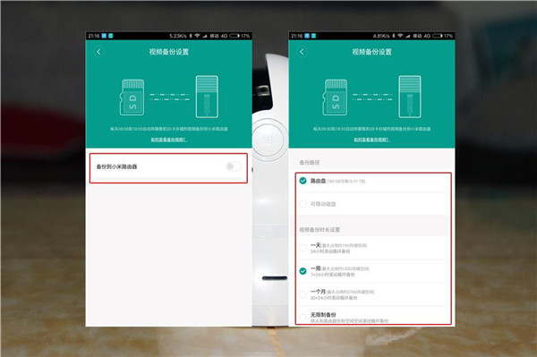 这个功能开启以后,当镜头范围内有物体移动时,小蚁云台摄像机才会开始录像。开启移动侦测的同时,如果你家里正好有小米路由器硬盘版,我们还可以选择将SD卡里面的视频信息备份到小米路由器的硬盘里面,开启备份以后,我们还可以设置视频备份的时长设置,在这里一共有5个选项,一天,一周,一个月和无限制备份。