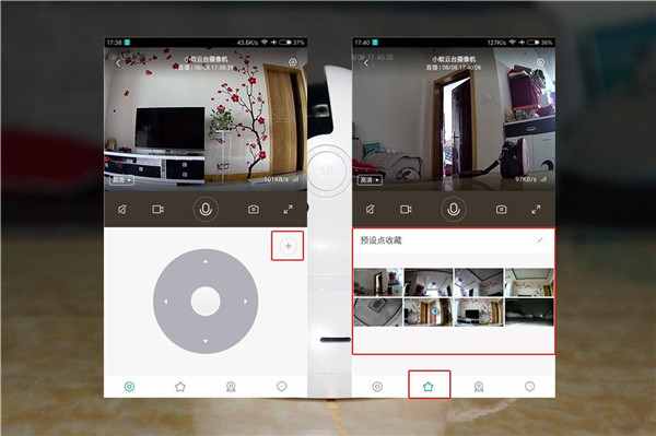 小蚁云台摄像机的预设点收藏功能设置方法也非常简单,我们在操作盘页面的右上角点击添加按键,即可将当前画面设置为预设点,每次设置都必须将摄像机对准不同的位置,设置好了以后,我们即可点击最下方的五角星图标进入到预设点收藏列表,我们需要点击不同的预设画面,摄像机就会自动转向该画面停留,非常方便。
