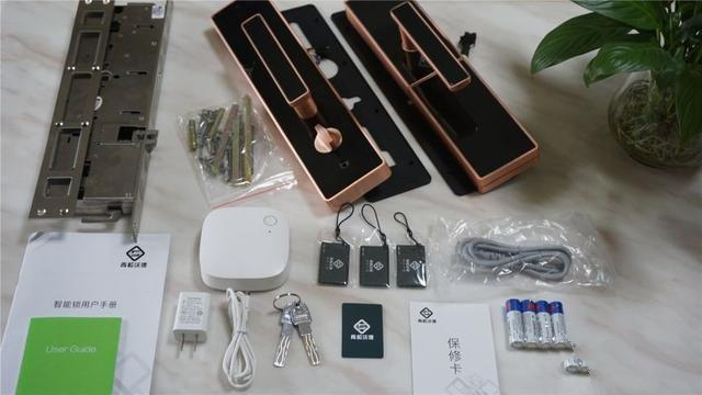 来张全家福,两把机械钥匙、三个智能卡、四节电池和一些五金配件,说明书,还有一zigbee网关,确实是比较丰富的。