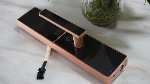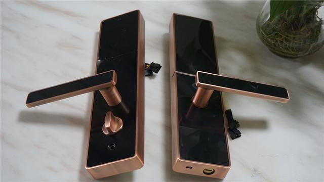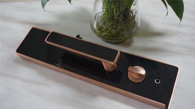 外面板功能更多,所以设计稍为复杂一些,同样为亚克力面板。门把手的造型更加美观,色调一致,让整个门面板看上去非常和谐。同时古铜色锌合金材料的运用,在保证了锁体强度的同时,也能带给使用者较好的视觉感受,最重要的是与绝大部分不同颜色大门都可以搭配。