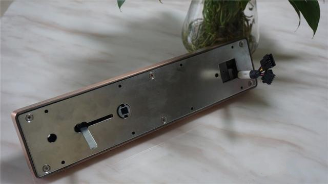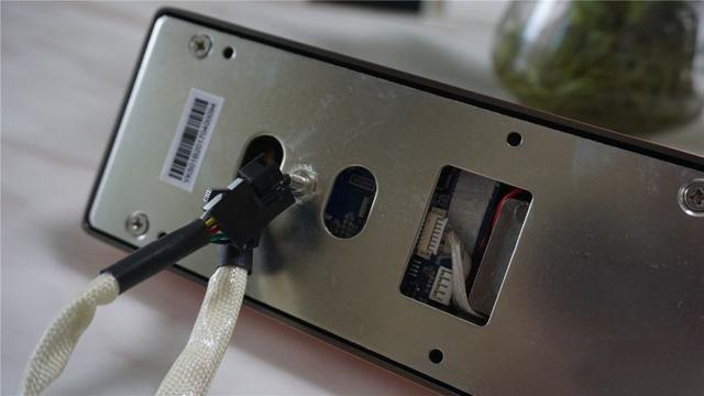 背面部分有金属加固,还预留有内反锁插销,其作用是晚上在家休息的进时候,只要反锁,门内、外都无法打开。内面板到还有数据线插口,主要用于内外面板、锁体之间的供电传输,并且数据线都采用编织网状管线保护,使得安装起来更牢固更令人放心。