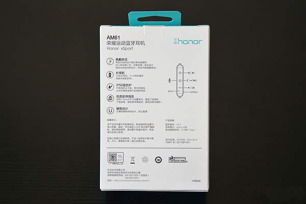 背面的介绍很详细:超长续航;IP55防护;轻量设计;语音通话;磁吸设计。