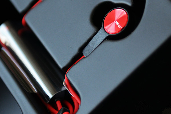 耳机外壳的红色部分为金属材质。高密度同心镭射CD纹的设计显得格外闪耀醒目,也提升了耳机的整体观感。