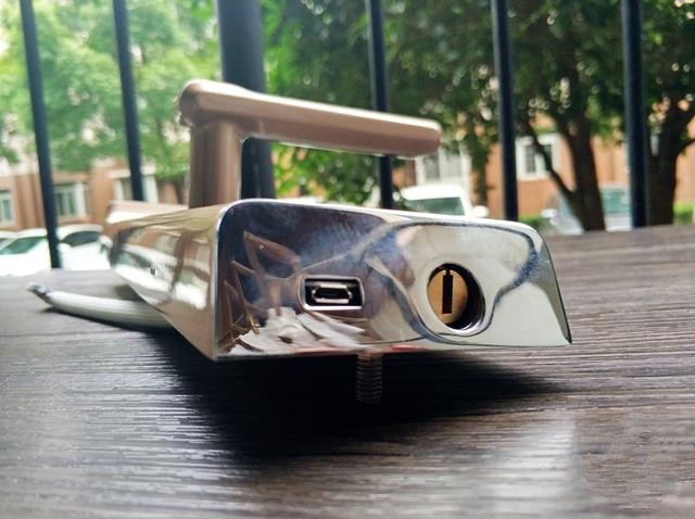 底部是机械钥匙孔和一个USB接口,非紧急情况下不建议大家使用机械钥匙开锁,这个只有在门锁指纹密码这些失效或者没电的情况下使用,而那个USB接口可以应急给门锁充电的。