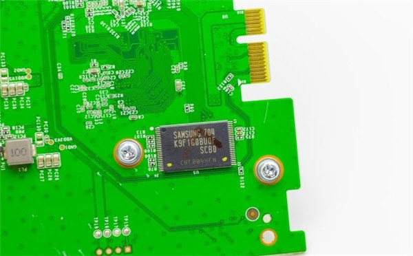 边角有一颗大芯片,K9F1G08U0F,三星最新版本的SLC存储芯片,容量128MB封装是TSOP48