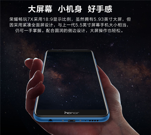 荣耀畅玩7X最大的亮点在于正面配备惊艳的全面屏设计,背面则为经典的三段式金属后壳, 荣耀畅玩7X采用了全面屏的设计,拥有多彩金属机身,有铂光金、幻夜黑、极光蓝三种配色。搭载了一款5.93英寸全面屏,屏幕纵横比为18:9,分辨率为2160*1080。搭载麒麟659八核处理器,运行4GB+32GB存储组合,内置3340mAh容量电池,持久续航。