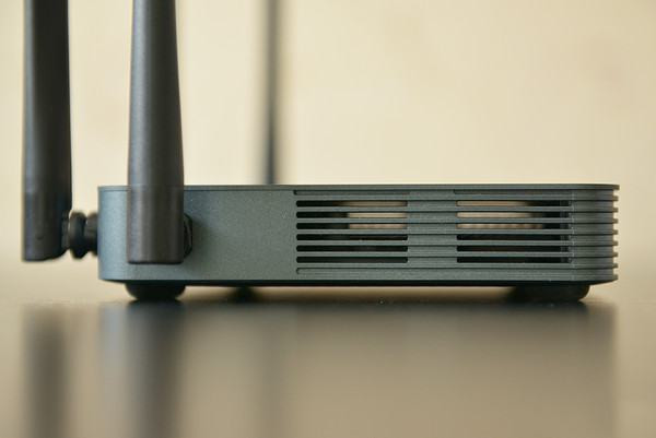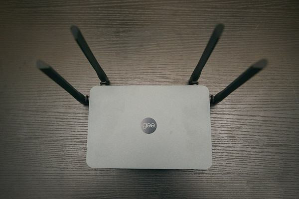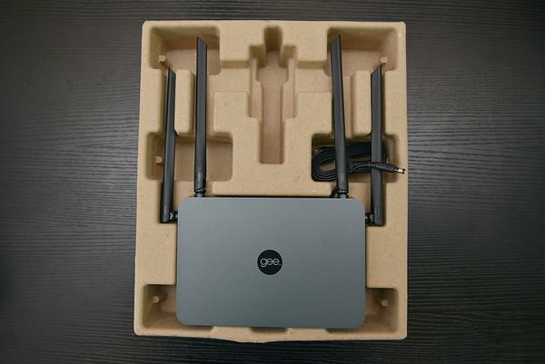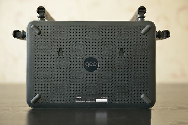 极路由B70正面采用金属材质,表面为黑色磨砂喷涂,外置四天线设计。位于机身面板中间,是极路由的品牌LOGO“gee.”机身底部,整齐的排列着大量散热孔,另外看其背部结构应该可以挂装,更省家居空间。