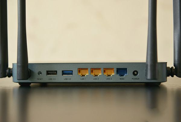 背面接口从左往右依次为:复位、USB2.0、USB3.0、千兆LAN×3、千兆WAN、12V电源接口。