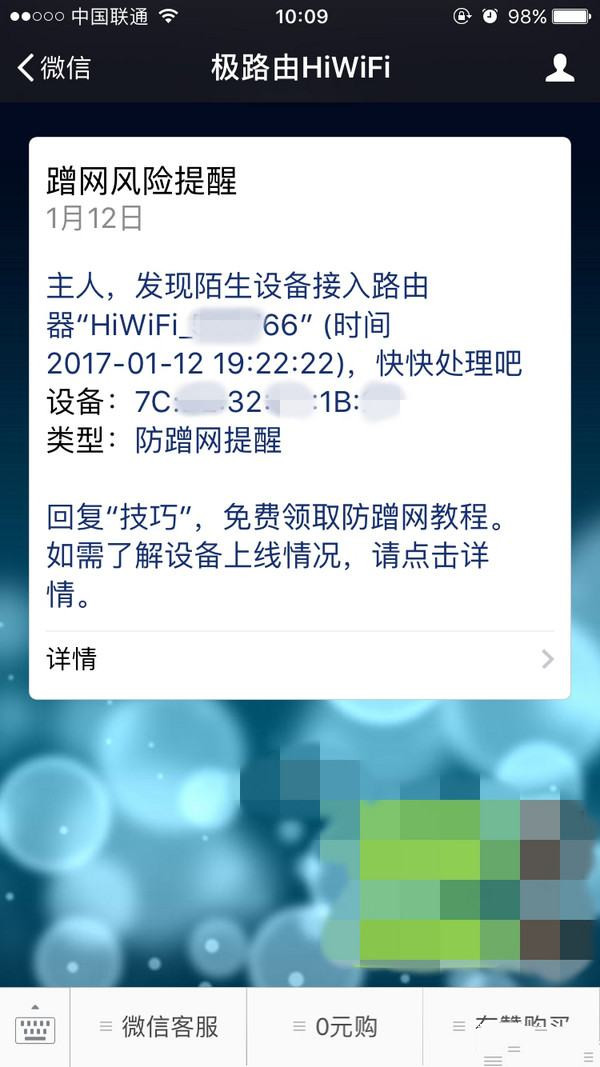 在微信上绑定路由器后,还能实时收到不明设备联网的推送提醒,感觉很有安全感。