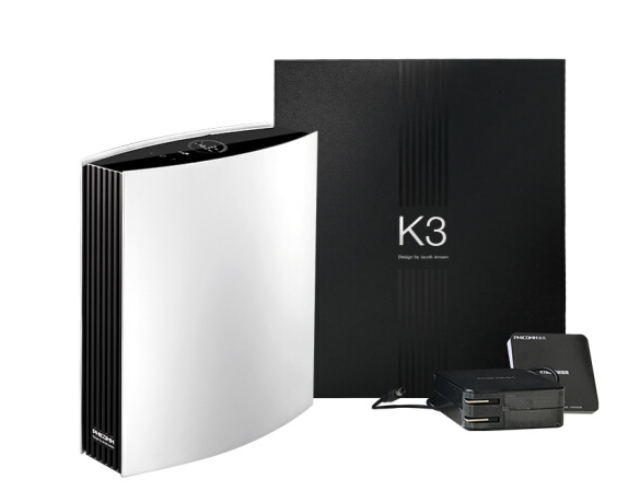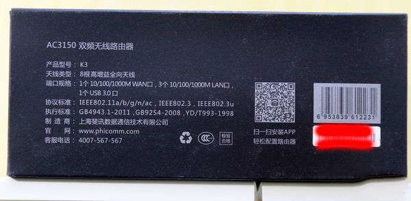 斐讯K3外包装采用纯黑配色、高档材质,简约设计营造出奢华。外包装还印有“Design by Jacob Jensen”字样,彰显出这款路由器的设计出自欧洲著名工业设计工作室的手笔