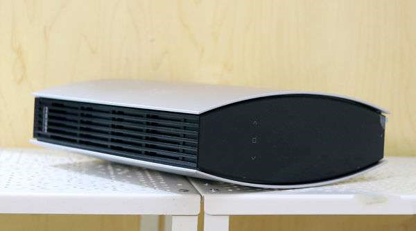 银色的面板平滑度和质感不错,看着很像金属,摸了才知道是塑料的。侧边为散热栅栏,能够很好地保证产品的散热,让设备全天正常工作。侧边底部设计有斐讯及Jacob Jensen工作室logo。