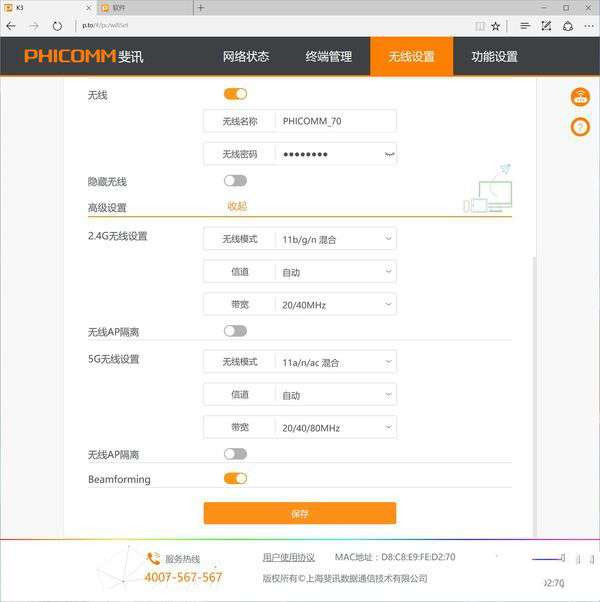 无线设置选项里,K3允许用户使用“双频合一”,就是将2.4G和5G频段结合,用户连接时,K3自动选择合适的信道。