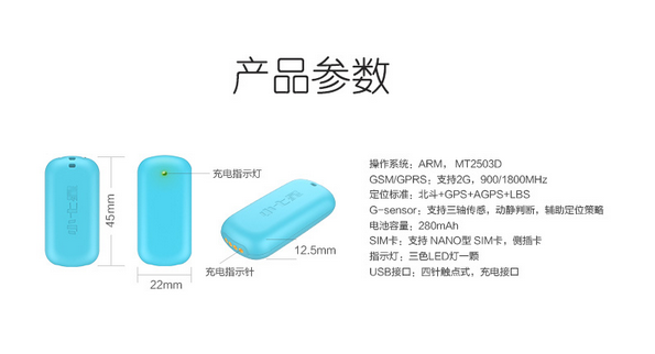 参数方面,整体尺寸45*22*12.5mm,重13g,马卡龙配色,三色LED指示灯,定位标准为北斗+GPS+LBS+AGPS四重定位,支持NANO型SIM卡,GSM/GPRS支持2G网络,支持三轴传感,动静判断,辅助定位策略,IP67级防水,充电1小时,待机1星期。