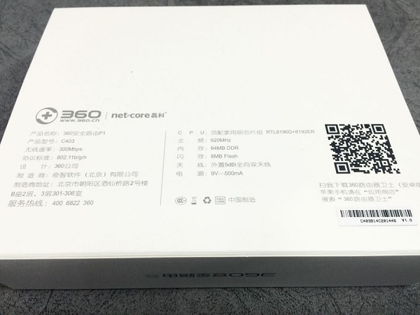 背部印有一些产品的相关参数,产品型号,CPU、内存数据、手机端App的下载二维码等等。