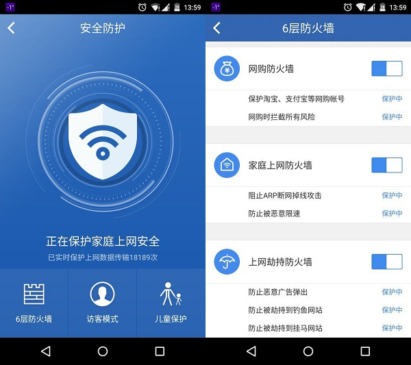 60的路由器产品也紧扣安全要素,在App中我们可以看到360安全路由P1中所存在的各种网络防火墙机制,并且设置有访客模式和儿童保护功能