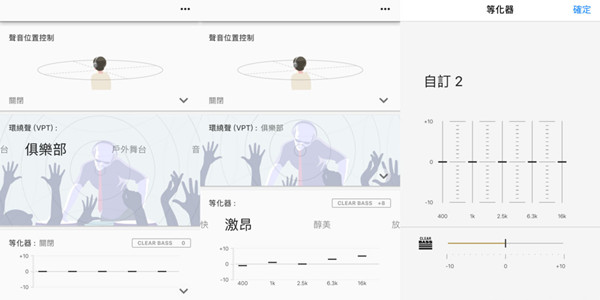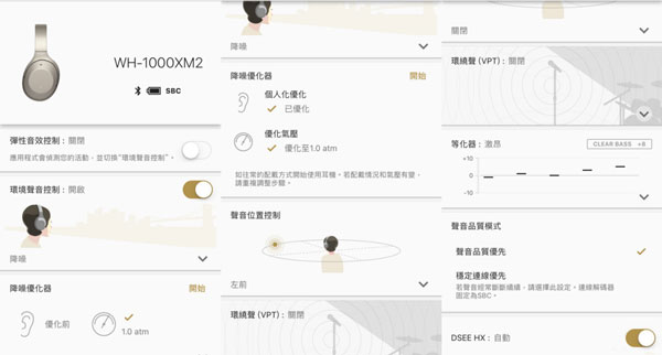 另外,WH-1000XM2 也同步支援 Sony DESS HX 数位放大技术,并能搭配 APP 中的环绕声、等化器以及声响位置等不同功能,自行调整为最适合聆听习惯的状况,以小编为例习惯打开 DESS HX、搭配较为沈重的等化器设定聆听垫子音乐,整体的音质表现算是与 MDR-1000X 走同一路子,整体音质、分离度都不错,算是较为着重中、高频领域,且低频算是恰到好处,喜欢重口味的人可能会稍觉不足(就是笔者 XD);至于环绕位置与环绕声设计,笔者自己是觉得开了不太习惯,因此大部分都是保持关闭状况,不过毕竟是个人感受居多,有机会的话也可视听看看,找出最适合自己的设定。