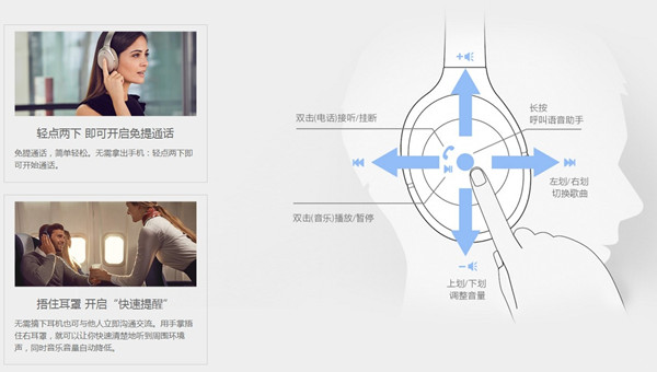 索尼WH-1000XM2的操作模式依旧沿袭了MDR-1000X上的设计,触摸式的操作对于用户而言实在方便!上下滑动是音量调节,左右滑动是切换歌曲,直接用手掌捂住耳罩就能自动开启环境音的效果,不需摘下耳机即可与人沟通!