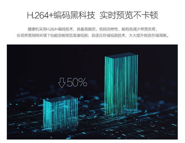 作为H.264视频编解码技术的升级版,同等网络环境下,H.264+产品的码率和存储平均降低50%。用户在享受流畅的高品质监控画面同时,只需购买之前所需一半的内存卡。此外,H.264+压缩技术能有效减少带宽负荷,在低带宽网络环境下也能流畅预览高清视频;自适应存储视频技术,大大提升有效存储周期,同样16G存储,H.264可存储960P录像约2天,H.264+则可以存储约4天。