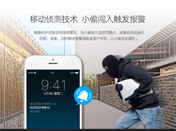 这款室外防水智能摄像机还具有敏锐的移动侦测技术,一旦开启移动侦测报警后,当小偷闯入监控范围内,设备会自动进行抓图、录像,同时推送报警消息至用户手机或者PC端,让小偷无处遁形,还能开启智能警报声,吓退不法分子。