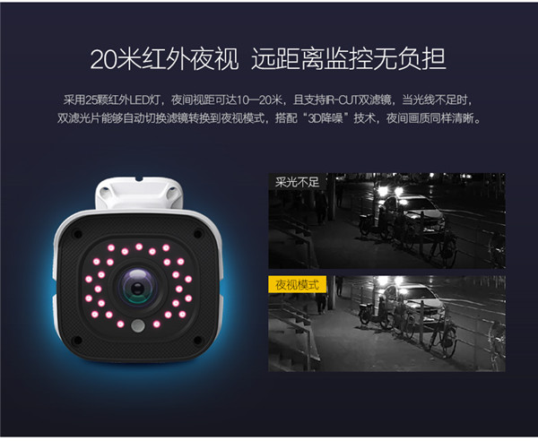 对于夜晚光线暗、异常情况频发的现象,雄迈枪机智能摄像机采用25颗红外LED灯,夜间视距可达5—20米,且支持IR-CUT双滤镜,当光线不足时,双滤光片能够自动切换滤镜转换到夜视模式,搭配“3D降噪”技术,夜间画质同样清晰。因此,夜晚再黑,室外防水智能摄像机也能记录下画面中的一举一动。