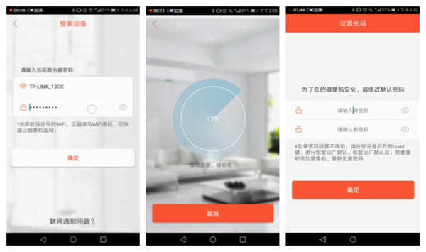 如果选择“是”,就会要求输入当前路由器的密码,输入完成后跳转至扫描搜索界面,发出“网络连接中,请稍后”的语音提示,等到发出“网络连接成功”,即设备显示在线,可通过无线查看管理设备,可以把网线拔掉。