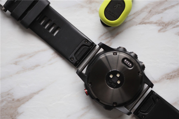 手表上有五枚按键,左侧三枚:灯光键(功能键)、上键(菜单键)、下键;右侧两枚:确认键、返回键。以往的 Fenix 系列产品,拆卸表带是一件非常麻烦的事情,拧螺丝是个麻烦事,换一次表带大概需要用上几分钟的时间。这一代上,Fenix 5 全系都用上了 QuickFit 表带,拆装只要三秒的时间, 从此拆洗表带再也不是难事儿了。