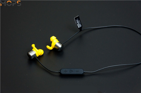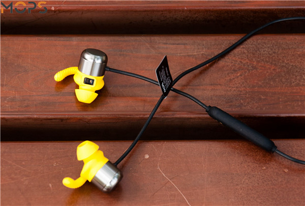 MOPS无线心率运动耳机整体设计偏向于年轻人的风格,接触人耳的部分采用了黄色硅胶材质,背面的腔体则是金属,线材部分采用了黑色的TPU材质,防腐耐磨,将黄色的骚气拉回来一点。耳机整体较为轻便,长度适中,作为微胖人士的笔者将脖子围成一圈后还有一段长度,相信大部分人都不会出现线材过短的情况。