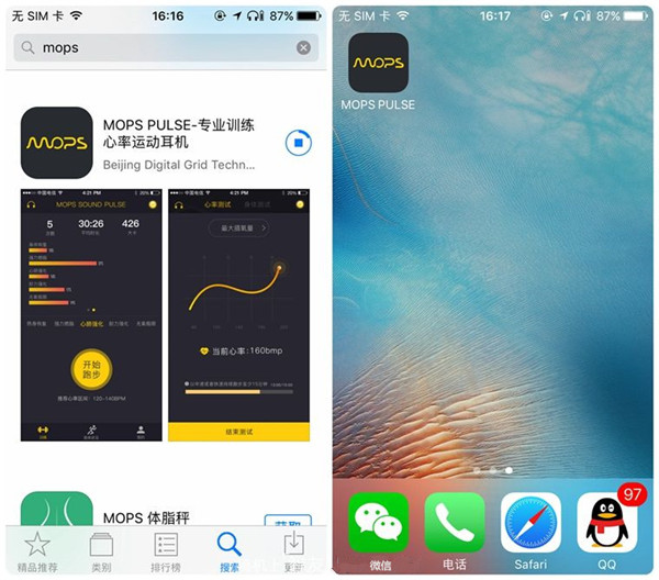 MOPS无线心率运动耳机的官方App,苹果端直接进入app store,而安卓则必须要通过google play搜索才行(豌豆荚无法检索到),所以扫码下载更加方便。