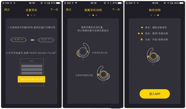初始化的界面会为消费者提供设置耳机、佩戴耳机说明、触控说明三种教学内容,便于用户快速掌握MOPS无线心率运动耳机的使用技巧。