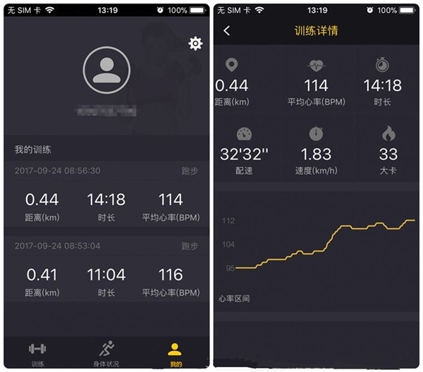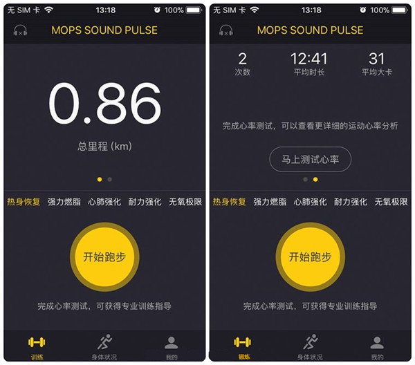 MOPS PULSE的主界面主要是针对运动选项设计,三个界面依次为训练、身体状况、我的。