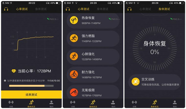 身体状况主要是帮助用户把握最大摄氧量和掌握身体恢复等指标。最主要的功能是进行15分钟心率测试,判断用户的心率个性特征,以此来指导身体机能的恢复训练。不过这个部分个人觉得存在BUG,因为个性化的心率特征会对运动的心率加以分析,但我按照要求进行了测试之后,数据无法保存,换言之就是这项非常具有意义的功能无法发挥作用,着实令人疑惑。