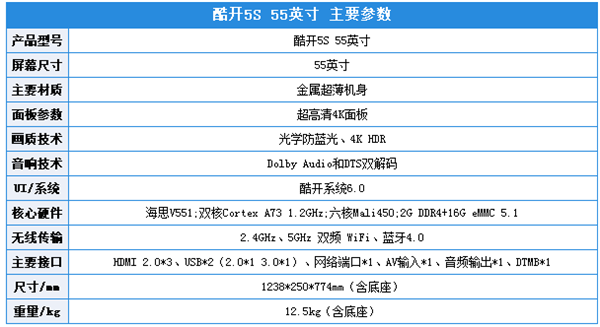 酷开5S 55吋电视身上四大拿手绝活。第一,光学防蓝光技术,可以做到画面不偏色的情况下保护视力健康。第二,首次采用海思高性能处理器,A73构架,具备超级解码实力。第三,全金属机身,创造了这个价位段精细打磨的典范。第四,人工智能,支持酷开精灵语音操作,甚至语音打游戏。