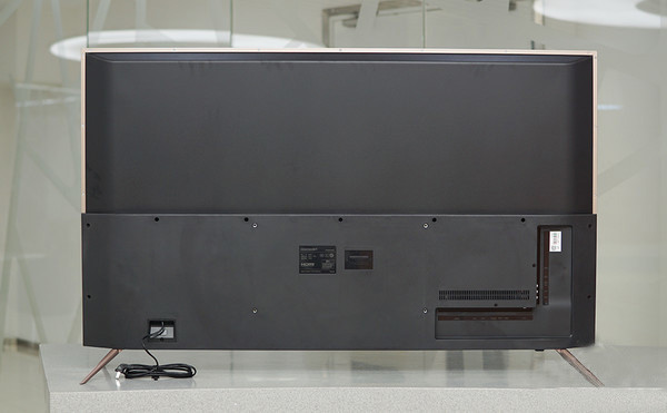 背面采用了一体化超薄背板,镁铝合金材质,比起普通电视使用的塑料背板,带来了更佳的散热能力和稳固性。配色方面,深灰色与金色的搭配,显得尊贵典雅。