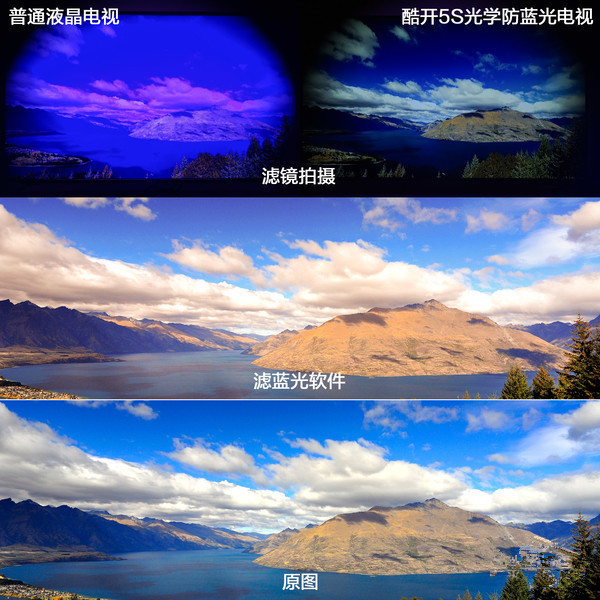 通过滤镜拍摄屏拍、PC打开滤蓝光软件屏拍图,以及原图之间的对比。可以明显感觉到普通液晶电视刺眼的蓝光、以及滤蓝光软件造成的严重偏黄偏红现象。