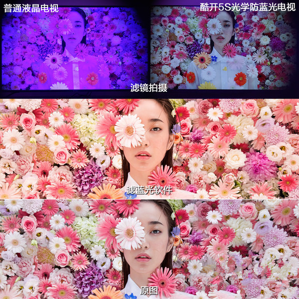 原图是一张小清新风格的“鲜花配美女”,酷开5S呈现对比度和饱和度更高,并没有因为防蓝光功能对色彩产生多大影响。而普通液晶电视刺眼的蓝光,像是贞子来了。