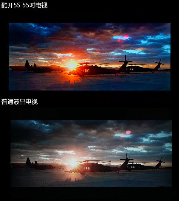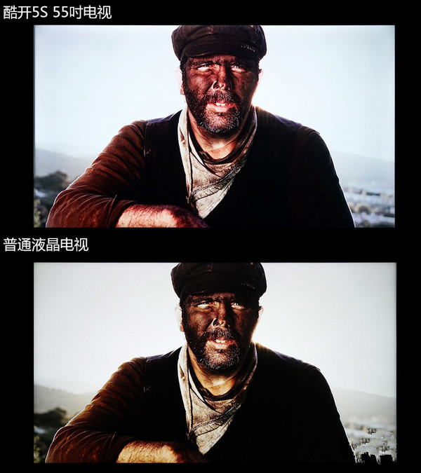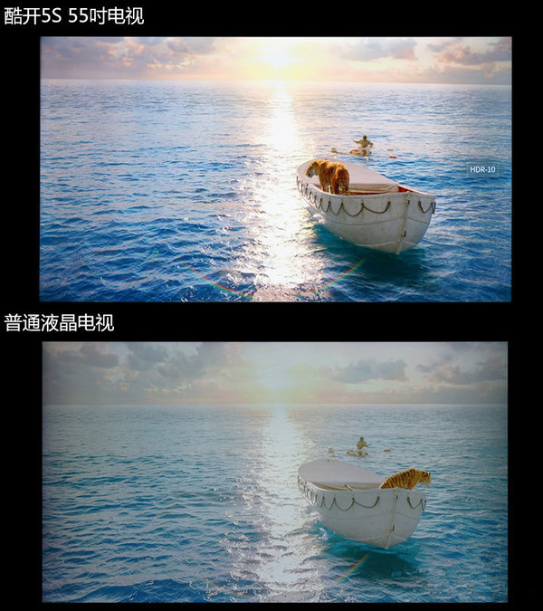 《少年派的奇幻漂流》电影片段,酷开5S明显在亮度、亮度层次、色彩方便表现更为突出,而下方的普通液晶电视像是蒙上了一层雾,整个画面比较混沌,虽然亮度也不低,但是显然对比度太低,画面缺少层次感。