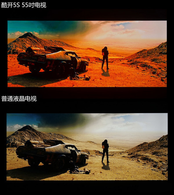 《疯狂的麦克斯:狂暴之路》电影片段,这是一部画风很浓郁的电影,普通液晶电视在色彩上就输掉了一截,表现得太过寡淡。从画面中车辆暗部的细节,还有天空中云朵的层次都能够感受到酷开5S有着更好的表现。