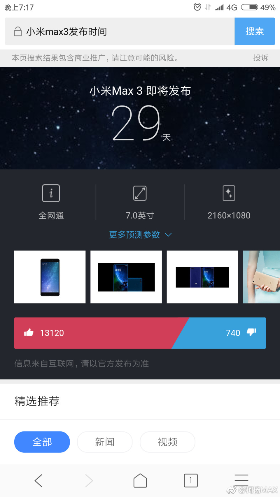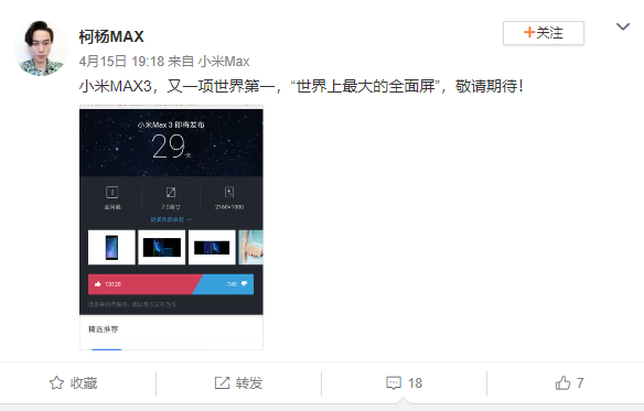 有趣的是,有微博网友用手机自带浏览器搜索“小米MAX 3发布时间”,而搜索引擎居然给出了答案。该博主发微博的时间是4月15日,搜索引擎显示小米MAX 3将会在29日后发布,如此推算的话,小米MAX 3的发布时间是5月14日。