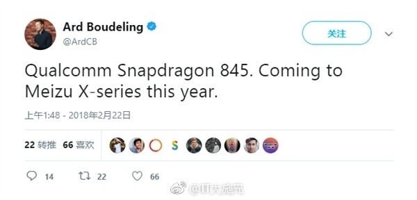 魅族手机一直以来都是小而美的代表,无论是设计还是UI,每组都代表了国产手机中的顶级水准。不过呢,广大魅族粉丝们最最期待的其实还是处理器的升级。这不最近就来了好消息,魅族全球营销总监Ard Boudeling在推特上爆料称,魅族新机将搭载高通骁龙845芯片了。