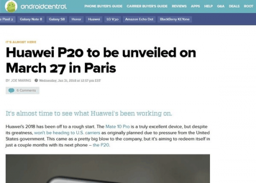 根据外媒Android Authority的最新报道,华为已经向国外媒体发送邀请,将于3月27日在法国巴黎召开新品发布会,不出意外届时将正式揭晓2018年的P系列旗舰新机,时间相比去年的P10系列晚了1个月左右,预计国行发布会将在4月举办。