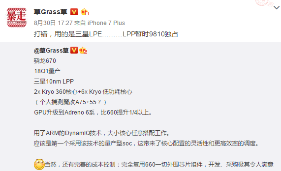 近日,骁龙660的下代升级产品670被网友曝光。据悉,这款处理器依然采用八核设计,和骁龙835一样的10nm工艺制程,在功耗方面表现出色。另外,更重要的一点是,骁龙670的GPU会升级为Andreno 6XX系列,性能会有比较大的提升。而骁龙660的GPU为Andreno 512,和骁龙835相比仍有差距。