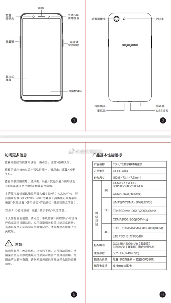 据微博网友@数码闲聊站 给出的资料,OPPO A83采用了5.7寸屏幕,分辨率为1440×720(18:9),屏占比看示意图还过得去,整机尺寸为150.5×73.1×7.7毫米。