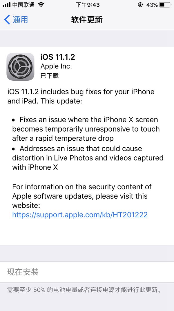 从更新描述来看,此次iOS 11.2正式版主要是针对iPhone与iPad修复Bug,修正了iPhone屏幕在温度下降后暂时失去触摸的问题。此外,还修复了iPhone X现场拍照和视频拍摄可能会导致图片扭曲的问题。