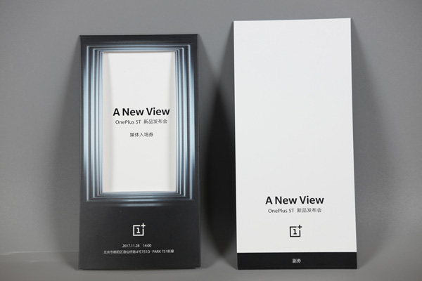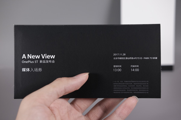 除了物品之外,一加5T也在包装内附加了纸质邀请函,与微博海报上的“ANew View”主题设计一致,具体发布信息为:北京市朝阳区酒仙桥路4号751D·PARK 751新罐,时间为下午14:00。