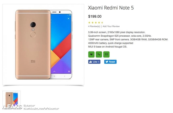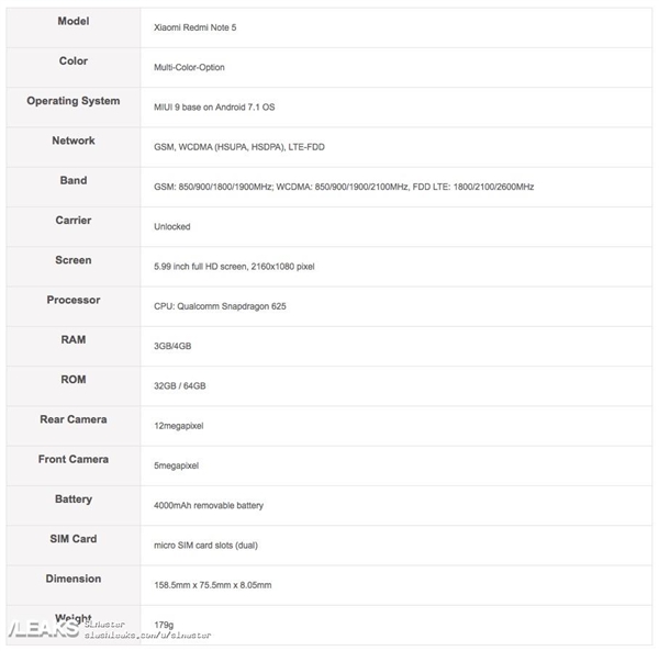 配置方面海外购物网站显示,红米Note 5采用5.99英寸全面屏设计,搭载高通骁龙625处理器,内置3GB/4GB RAM+32GB/64GB ROM,后置1200万像素单摄,预装MIUI 9操作系统。