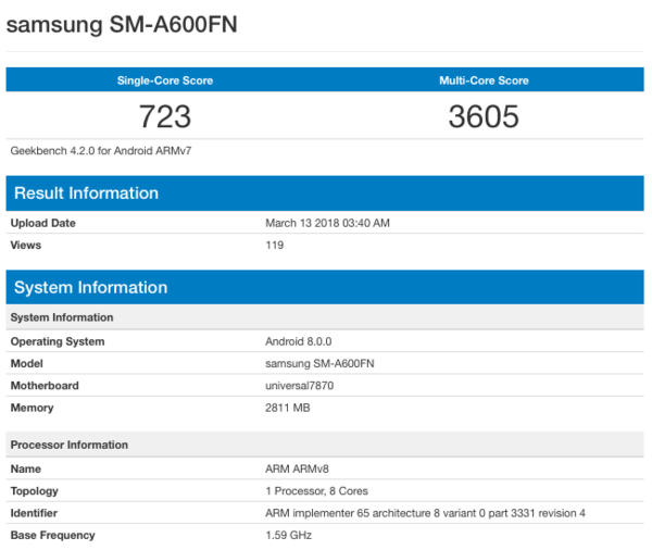 Geekbench数据库显示,三星A6搭载跟2017版三星A3以及三星J8等相同的Exynos 7870处理器,其主频为1.59GHz,内置3GB运存;三星A8+则搭载骁龙625处理器(msm8953),主频为1.8GHz,内置4GB运存。两款新机都运行Android 8.0系统。