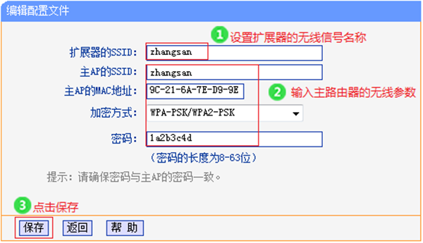 输入主路由器的wifi名称、MAC地址、无线密码,并设置扩展器的wifi名称,点击保存。