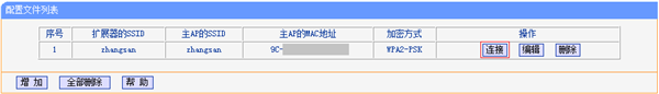 在配置文件列表中可以查看增加的条目,点击连接,扩展器自动扩展主路由器的无线信号。