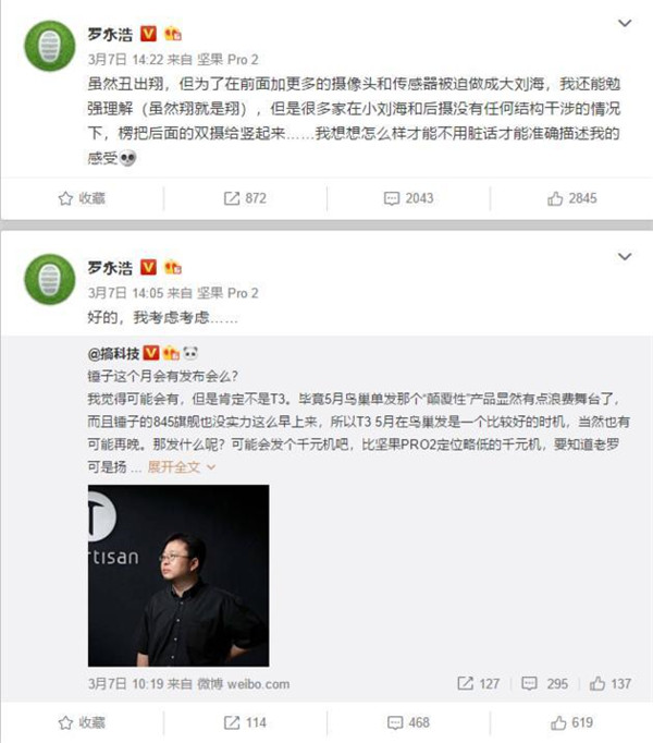 坚果pro3什么时候出值得注意的是,在今年智能手机开始流行异形屏设计的情况下,有网友希望锤子科技能够避免使用刘海屏,但@罗永浩给出的回复,则被解读为暗示可能会采用刘海屏设计。因此,如果这次出现的OC105和OC106确为坚果PRO3系列的话,那么或许最大的改变便会引入了刘海屏的造型,这样也符合坚果PRO系列在更新换代的时候,外形上都会有所变化的做法。
